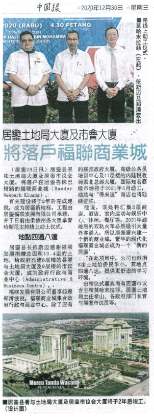 The relevant construction will be completed in two years and will become a new landmark in Kluang. The project will be constructed by Kluang Hock Lian Development Co., Ltd., and the online groundbreaking ceremony was hosted by Datuk Hasni, the Minister of State of Johor.