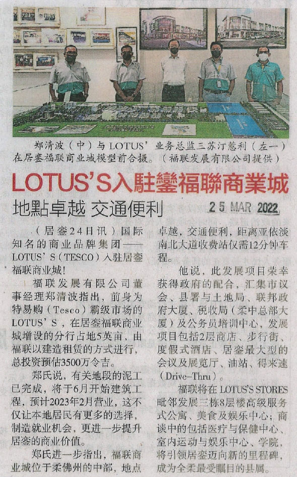 Kluang Hock Lian Development Co., Ltd. Managing Director Cheng Qingbo pointed out that LOTUS’S STORES, formerly known as Tesco hypermarket, will open an additional branch in BANDAR NEWPARK KLUANG, Kluang Hock Lian Commercial City.
