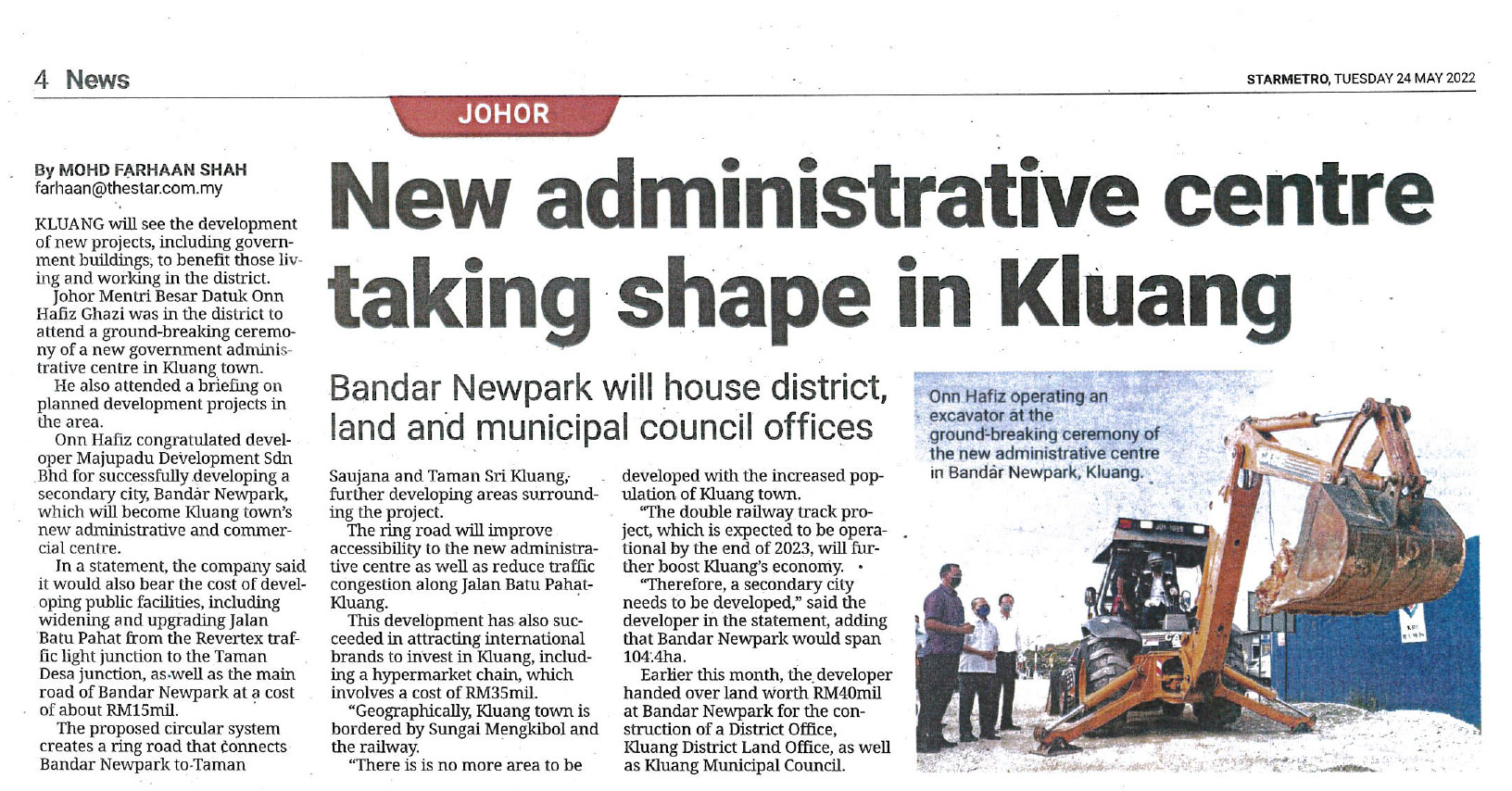 Onn Hafiz congratulated developer Majupadu Development Sdn Bhd for successfully developing a secondary city, Bandar Newpark, which will become Kluang town’s new administrative and commercial centre.